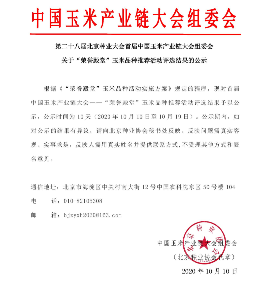 根据《“荣誉殿堂”玉米品种活动实施方案》规定的程序,现对首届中国玉米产业链大会——“荣誉殿堂”玉米品种推荐活动评选结果予以公示,公示时间为10天(2020年10月10日至10月19日)。公示期内,如对公示的结果有异议,请向北京种业协会秘书处反映。反映问题需真实客观、实事求是,反映人需用真实姓名并提供联系方式,不受理其他方式和匿名意见。
